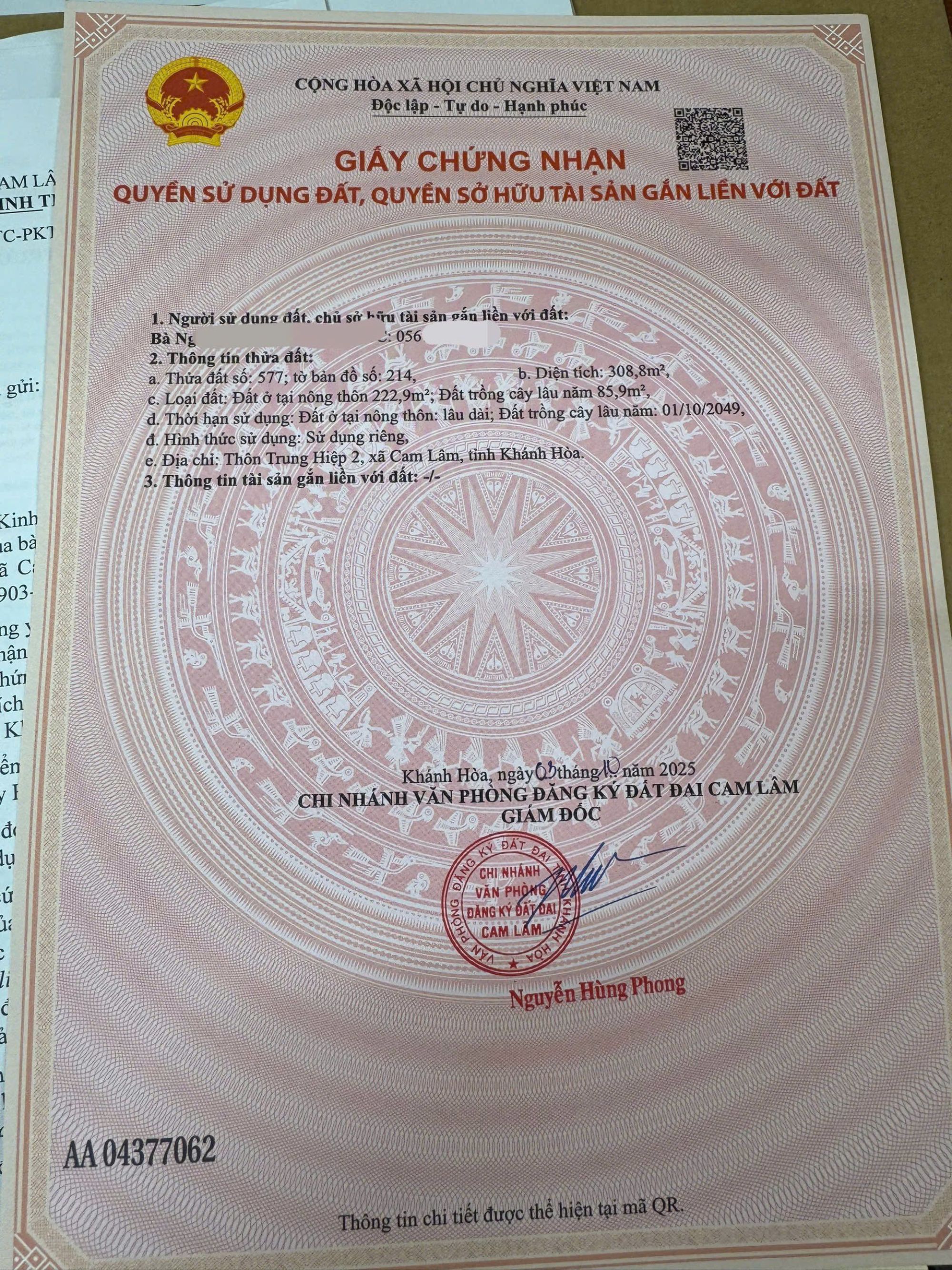 - Dt 308 m2 (222 m2 thổ cư ) ngang 6m đường rộng 2 oto tránh nhau