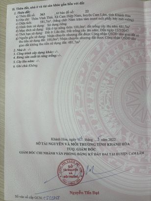 - Tổng diện tích: 581.7m2 ( 100m2 thổ cư )
