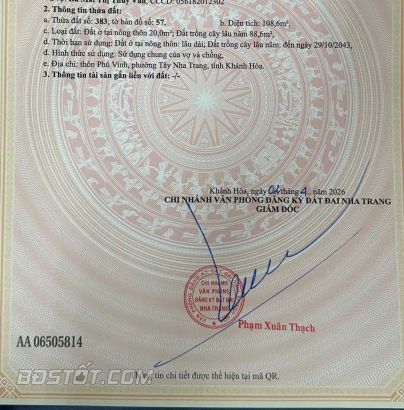 Bán gấp lô đất đẹp 108.6m2 hẻm Cầu Bè, Phú Vinh, Vĩnh Thạnh, Nha Trang, Khánh Hòa