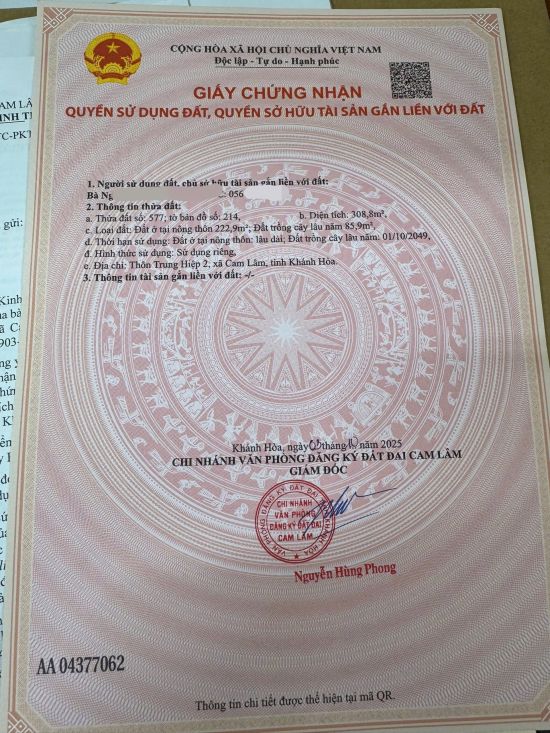 - Khu bàn cờ đông dân cư Cam Hiệp Bắc cũ  - Dt 308 m2 (222 m2 thổ cư ) ngang 6m đường rộng 2 oto tránh nhau- 20p sân bay Cam Ranh - biển bãi dài  liên hệ 0365 345 579...