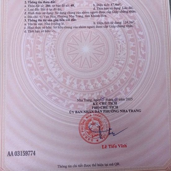 Bán nhà chính chủ Diện tích : 87,4m2 full thổ cư Vị trí đường Vạn Hòa , Khu chợ đầm phường Vạn Thạnh cũ , tp Nha Trang khu chợ lớn nhất Nha Trang , đường rộng 16m2 vỉa hè đầy đủ giá bán :...